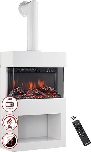 KAMINIO Cheminée Electrique HENRI avec tuyau de poêle – Poêle Électrique avec chauffage, effet de flamme 3D, compartiment à bois, télécommande (Blanc)