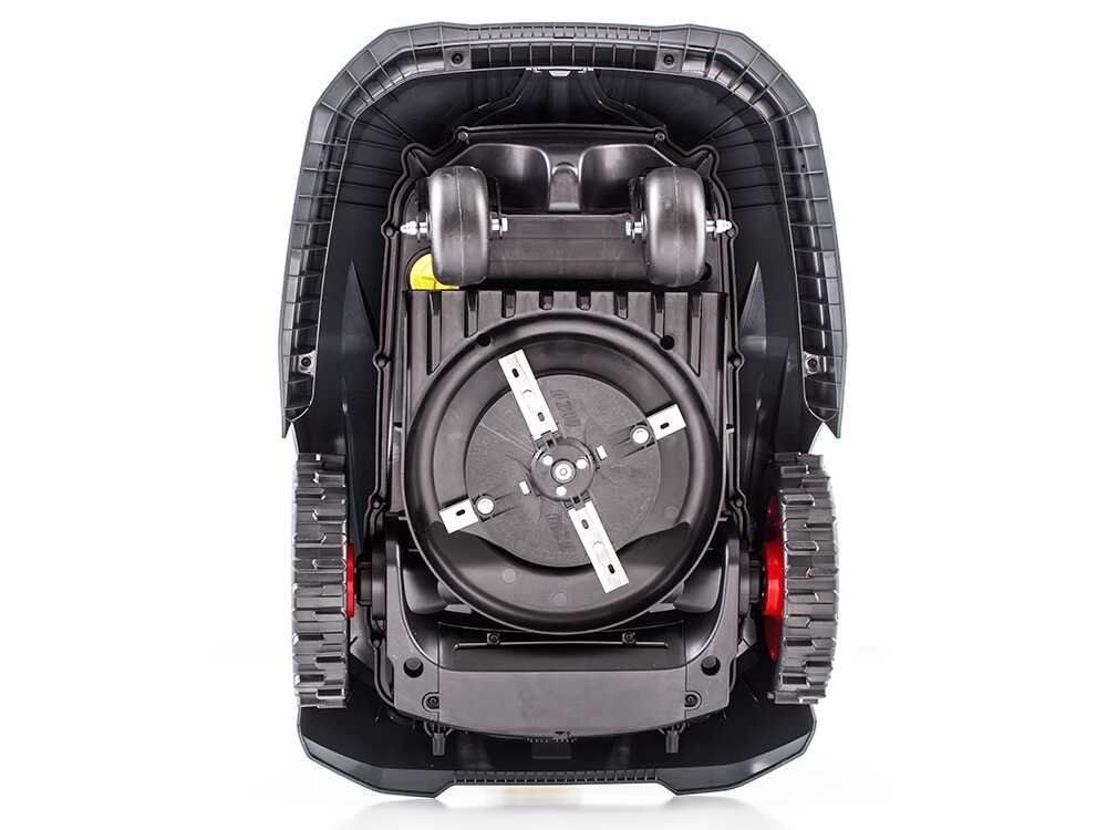 Le robot est équipé de deux roues à forte traction qui l’empêchent de glisser, même sur des pentes raides. Les deux roues pivotantes à l’avant stabilisent encore davantage le robot tondeuse.