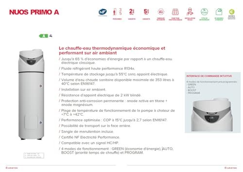 • ENERGY SAVING: Nuos Primo draws free calories from the air to heat water and save up to 65% electrical energy compared to a conventional electric water heater. One-piece design, it can be installed on ambient air, without ducts