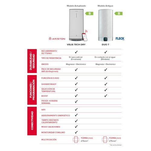 Ariston Velis Tech Dry Wifi (e.g. Fleck Duo 7) – Electric multi-position water heater 50 liters with Wi-Fi and ECO-EVO 79.8 x 27.5 x 51.5 cm Installation in Spain