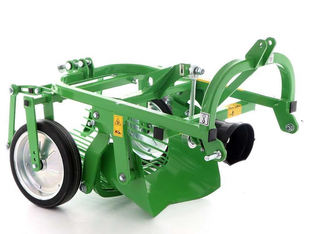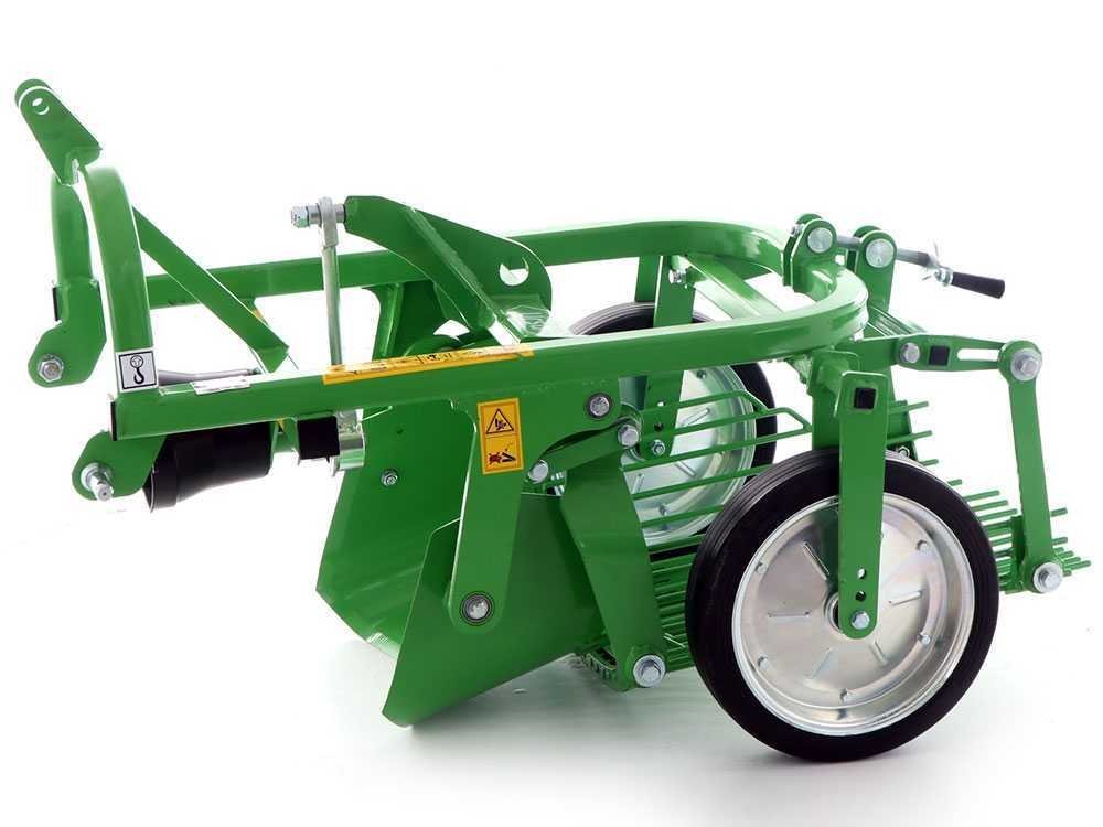La machine est constituée d’un soc vibrant avec profondeur d’excavation réglable qui transfère les pommes de terre et la terre sur la trémie vibrante en tamisant les pommes de terre du sol. La profondeur d’excavation est réglée par les roues de support arrière.