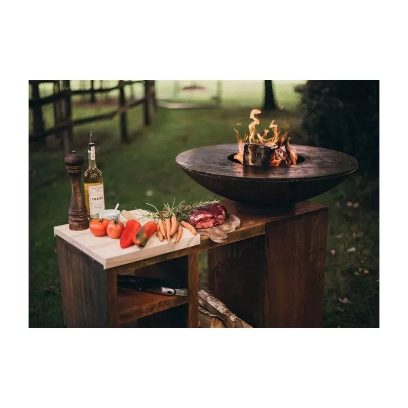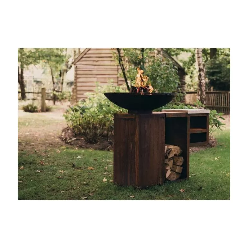 Cet accessoire est prévu pour accueillir une plancha C 80 ou C 100. Un billot en bois vous permet de préparer les viandes et ingrédients à cuisiner. Un grand casier permet de stocker du combustible. Fabriqué en acier corten, il est résistant aux intempéries .