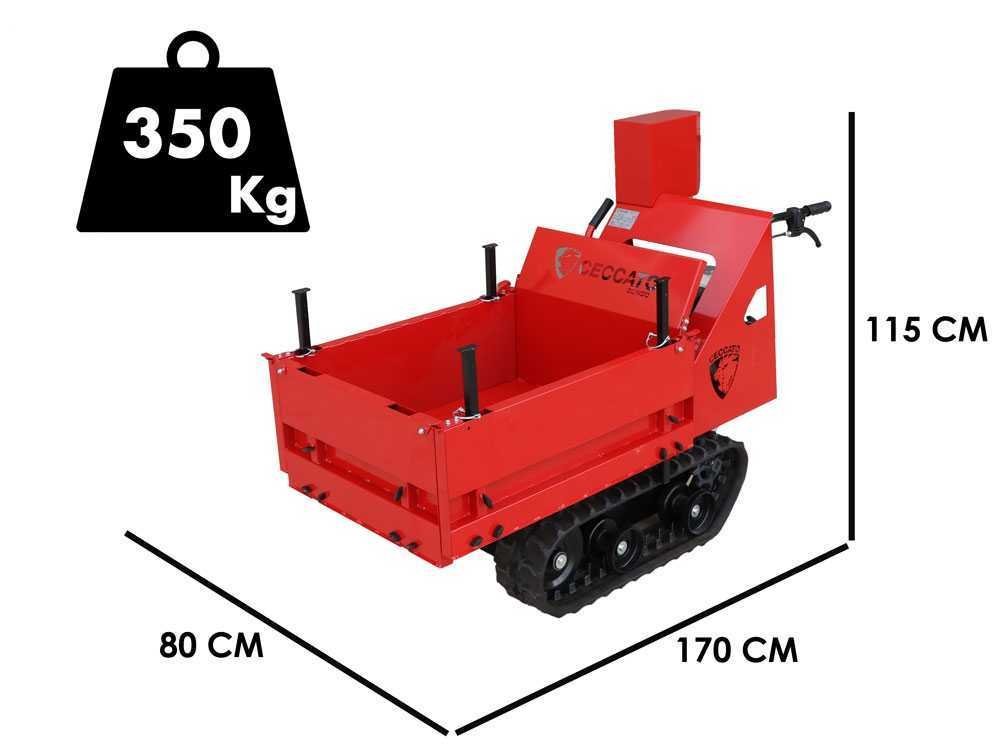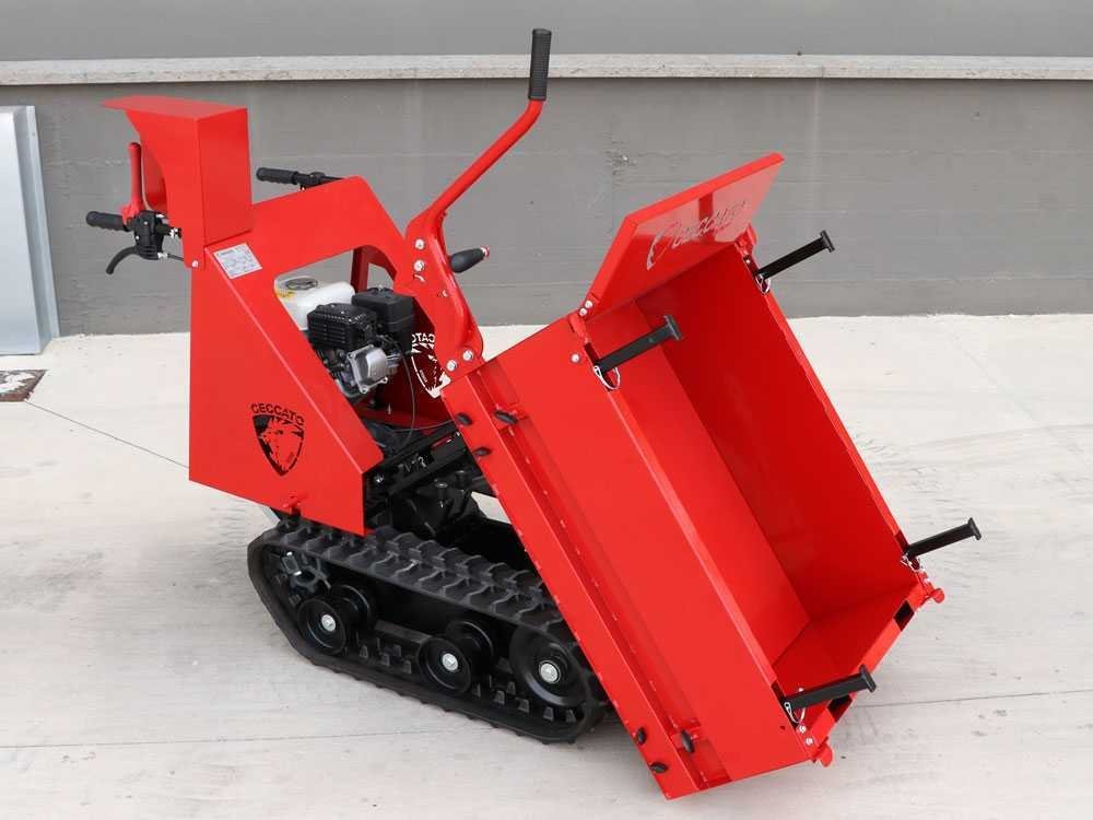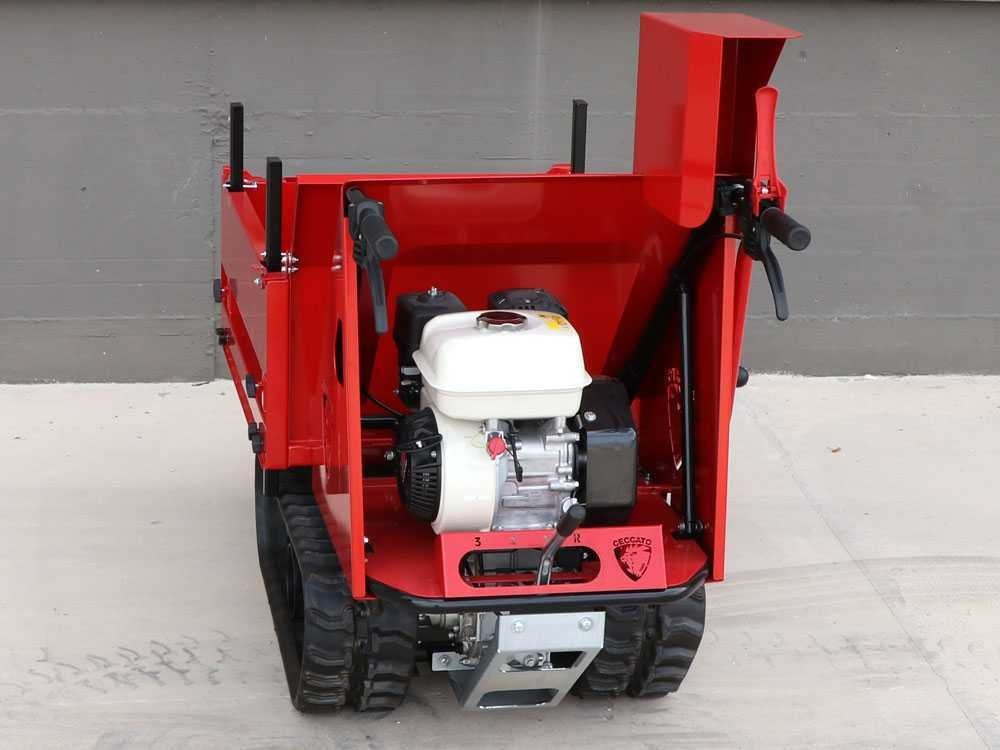 La base à chenilles possède un moteur Honda GP160 qui permet à la brouette de transporter 350Kg jusqu’à une pente maximale de 20%. En outre, il possède une boîte à trois vitesses en marche avant et une vitesse en marche arrière ainsi qu’un caisson basculant extensible manuellement.
