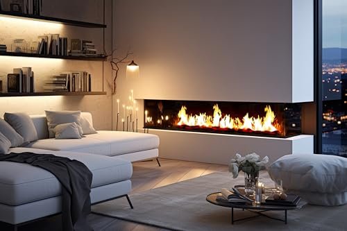 - ENERGY SAVING FEATURES AND DESIGN: With a power of 10W to 2000W, this fireplace in steel and black tempered glass has overheating protection. It can be flush mounted or wall mounted and comes complete with decorative logs of all sizes, clear and red crystals. Consumes only 10W in flame mode