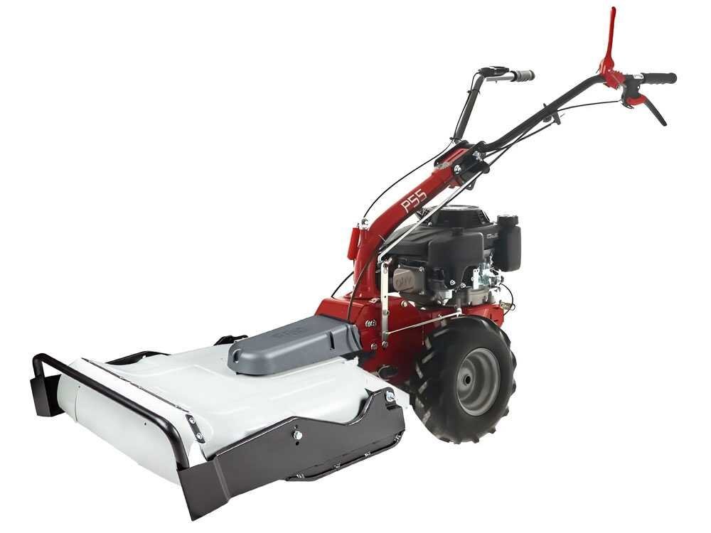 La tondeuse débroussailleuse thermique P 55 est une machine à moteur thermique autotractée, dotée de roues pneumatiques profilées tractées, et reliées à une transmission avec vis sans fin par bain d’huile.
