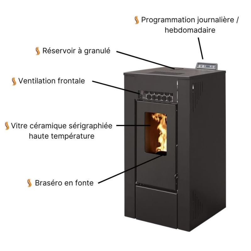 - Possibilité de programmation sur 7 jours, avec différentes plages horaires de fonctionnement. Le Poêle est équipé d’une sonde ambiante, qui vous permet de choisir entre 2 fonctions. Le choix entre ces deux modes se fait en fonction de la configuration de votre maison : Le mode « stand-by » permet au poêle de s’arrêter arrivé à température demandée et de redémarrer lorsqu’elle redescend. Le mode « modulation » permet au poêle de se réguler automatiquement sans jamais s’arrêter