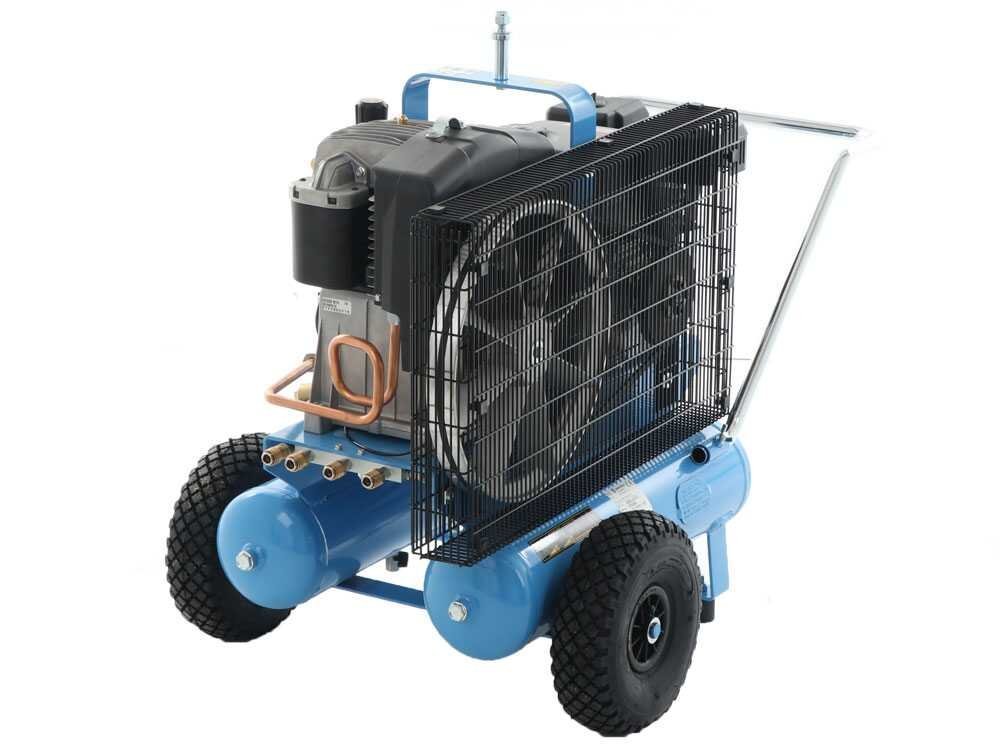 Le motocompresseur est monté sur un châssis équilibré avec double réservoir pour réduire l’effet de condensation. Ce modèle est équipé de deux réservoirs de 11 litres chacun pour une capacité totale de 22 L.