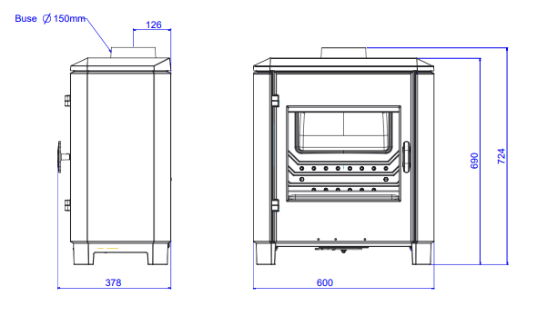 Distance minimale à respecter par rapport aux matériaux combustibles adjacents : arrière 60 cm / latérale 60 cm