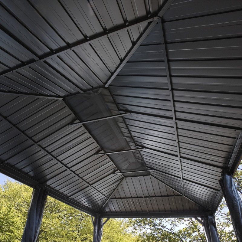 Cette magnifique pergola autoportante Messina couvre plus de 20m² pour accueillir un salon de jardin ou pourquoi pas un spa ou un jacuzzi. Elle est réalisée en aluminium pour la structure et en acier galvanisé pour la double toiture.