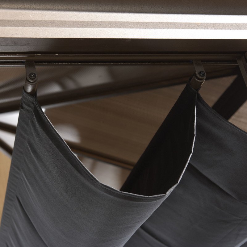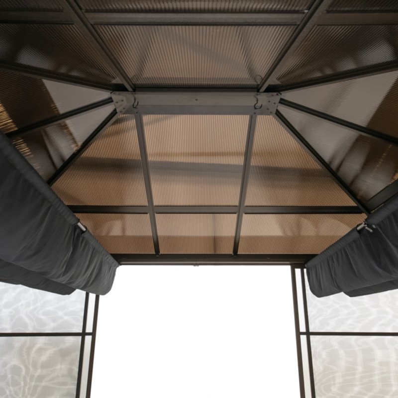 Avec le jardin d’hiver Castel, restez en contact avec la nature tout au long de l’année. Ce pavillon est composé d’une structure en aluminium thermolaqué couleur bronze surmontée d’une toiture en panneaux de polycarbonate à doubles parois de 8mm d’épaisseur. Ce modèle exclusif est fabriqué par le spécialiste canadien des pavillons de jardin Sojag. Les parois sont constituées de cadres rigides sur lesquels sont tendues des moustiquaires.