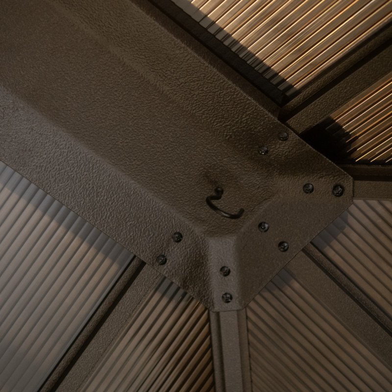 Les poteaux sont munis de 3 trous pré-percés pour leur fixation, la visserie d’ancrage n’est pas fournie car elle dépend du support, qui peut être une dalle de béton, du dallage ou une terrasse en bois. Ce modèle est conçu pour résister à une charge de neige de 125kg/m² et ne craint pas la corrosion. La visserie de montage incluse est intégralement en acier inoxydable, ce pavillon ne devra donc pas être démonté pendant la saison hivernale. Deux crochets de fixation multi usage présents sur la barre faîtière permettent l’accrochage d’un système lumineux ou de jardinières suspendues.