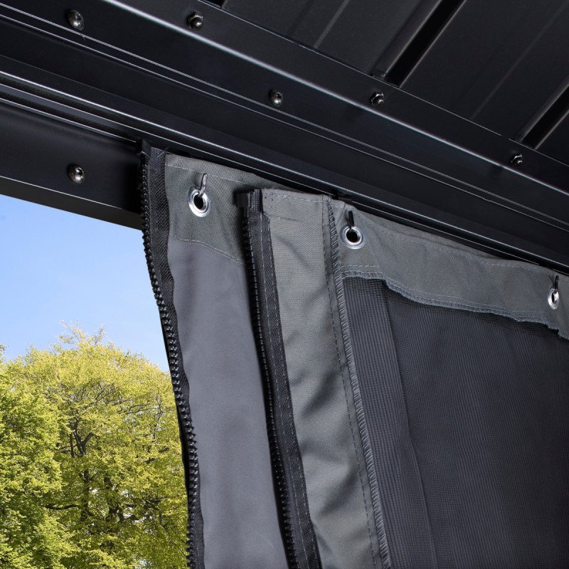 Cette pergola est dotée d’une toiture solide constituée de tôles en acier galvanisé aux rayures horizontales, rappelant un agencement harmonieux d’ardoises de la même couleur que la structure. Ce produit de grande qualité vous est proposé par le spécialiste canadien des constructions de jardin, Sojag. Habitués des conditions climatiques sévères, tous leurs abris sont conçus pour résister durablement aux intempéries : neige, pluie ou soleil. La toiture peut soutenir une charge de neige impressionnante de 150kg/m² et le revêtement par thermolaquage ainsi que la toiture galvanisée ne craignent aucunement la corrosion.