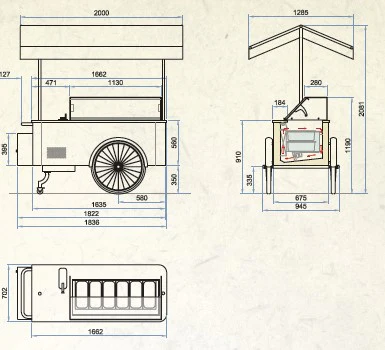 Dimensions du chariot à glace : L. 2000 x P. 1285 x H. 2081 mm.